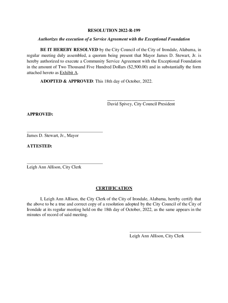 RESOLUTION 2022R199 Authorizes the execution of a Service Agreement with the Exceptional Foundation BE IT HEREBY RESOLVED by the City Council of the City of Iron dale, Alabama, in regular meeting