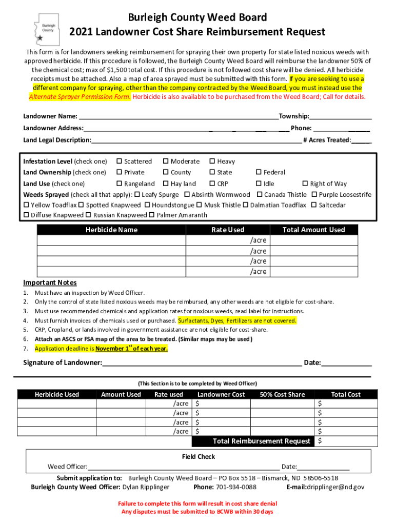 Burleigh County Weed Board 2021 Landowner Cost Share Reimbursement Request This form is for landowners seeking reimbursement for spraying their own property for state listed noxious weeds with approved