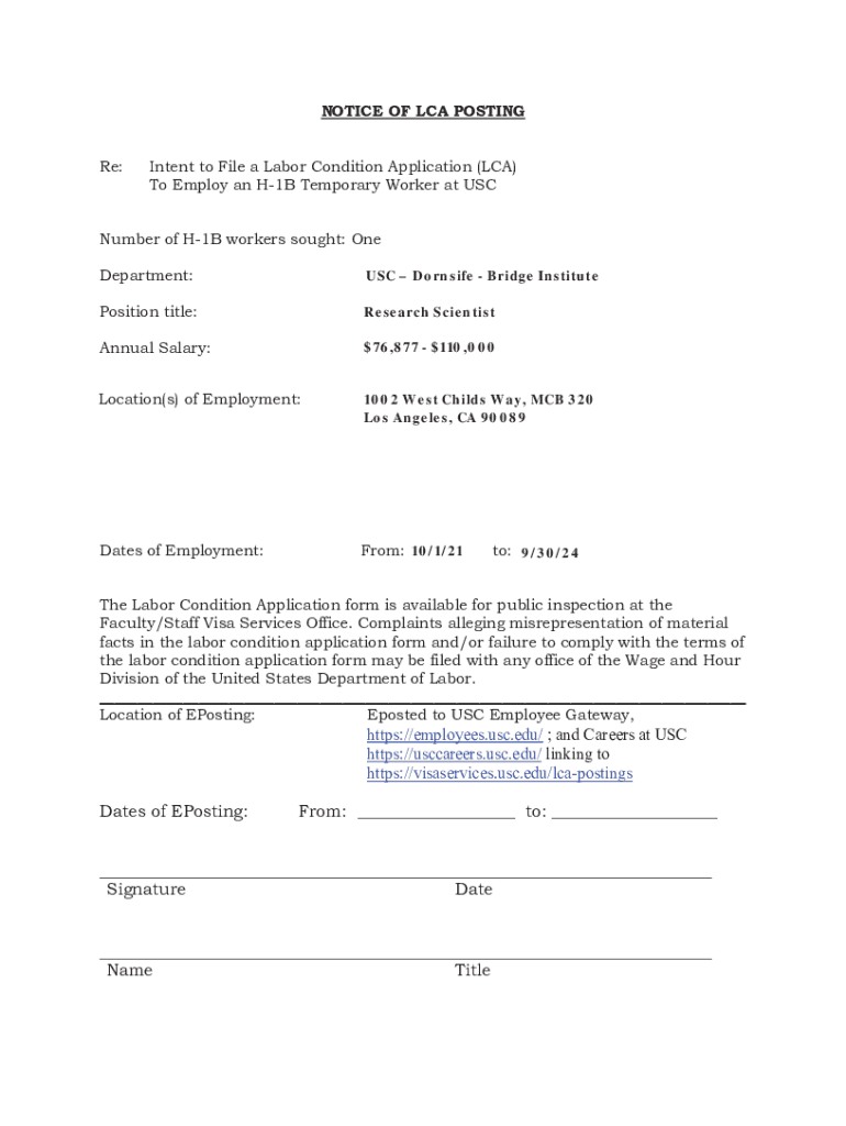NOTICE OF LCA POSTING Re:Intent to File a Labor Condition Application (LCA) To Employ an H1B Temporary Worker at Number of H1B workers sought: One Department:USC Downside Bridge InstitutePosition