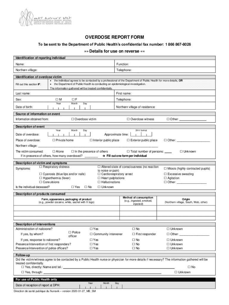 OVERDOSE REPORT FORM To be sent to the Department of Public Health confidential fax number: 1 866 8678026 Details for use on reverse Identification of reporting individual Name:Function:Northern village:Telephone:Identification