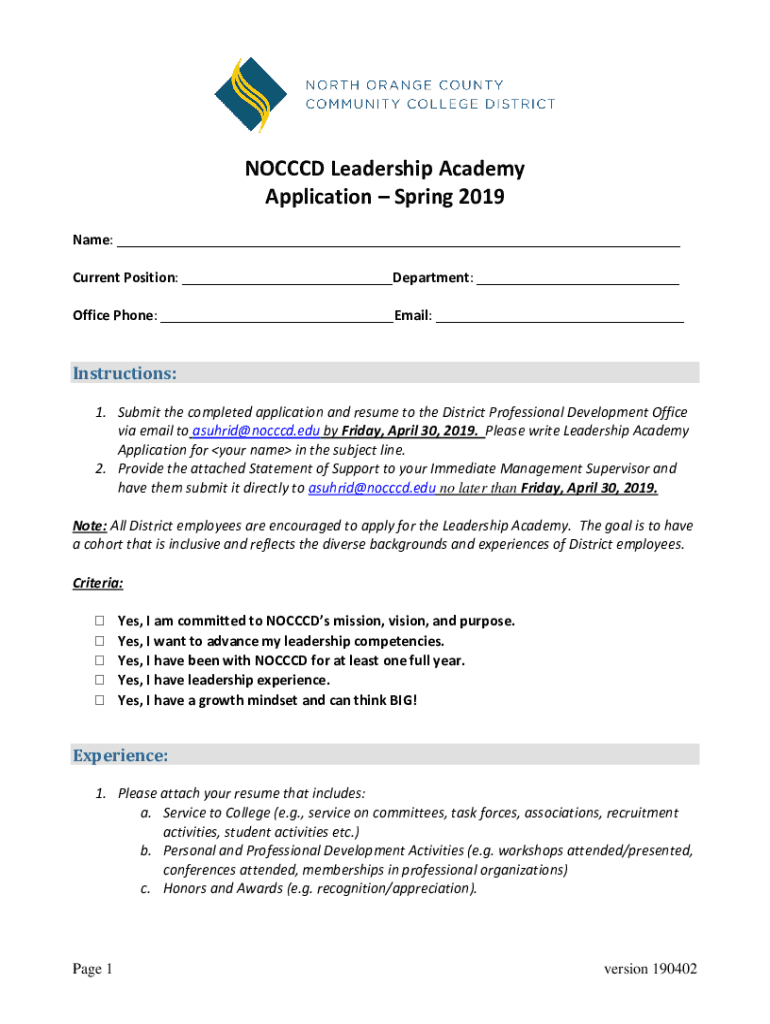 FORCED Leadership Academy Application Spring 2019 Name: ___ Current Position: ___Department: ___ Office Phone: ___Email: ___Instructions: 1. Submit the completed application and resume to the District