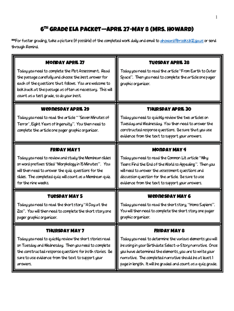 16th Grade ELA Packet April 27May 8 (Mrs. Howard) **For faster grading, take a picture (if possible) of the completed work daily and email to ahoward@brooks.k12.ga.us or send through Remind. Monday