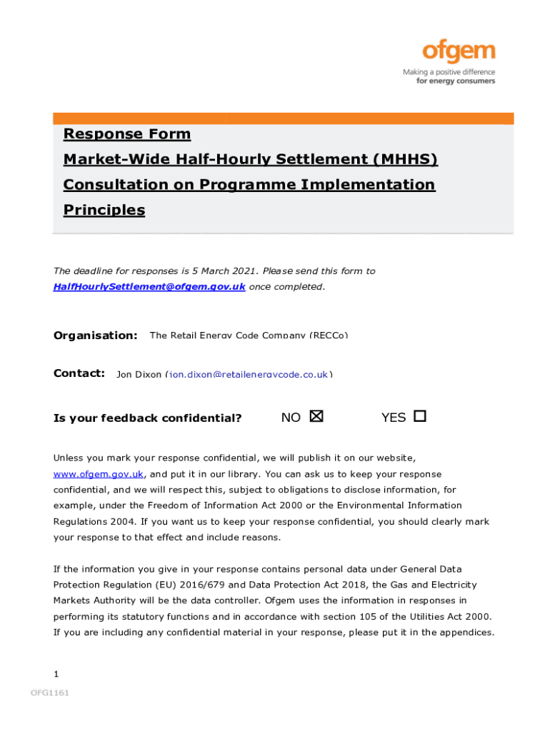 Response Form Marketing Half-hourly Settlement (HHS) Consultation on Program Implementation Principles deadline for responses is 5 March 2021. Please send this form to HalfHourlySettlement@ofgem.gov.uk