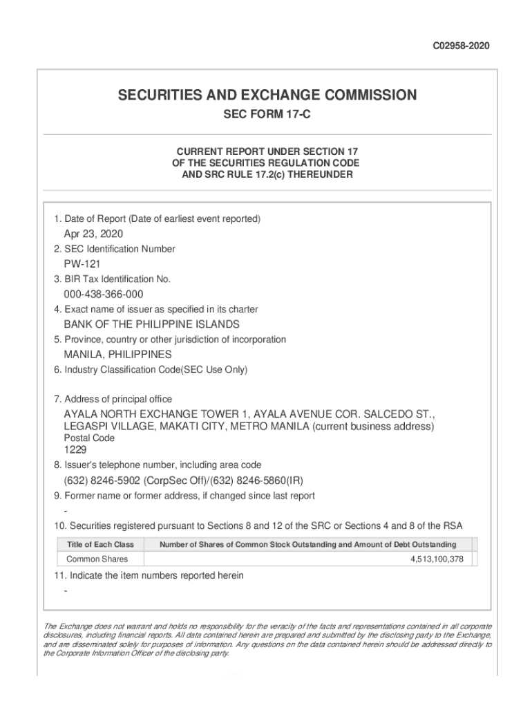 C029582020SECURITIES AND EXCHANGE COMMISSION SEC FORM 17C CURRENT REPORT UNDER SECTION 17 OF THE SECURITIES REGULATION CODE AND SRC RULE 17.2(c) THEREUNDER1. Date of Report (Date of the earliest event