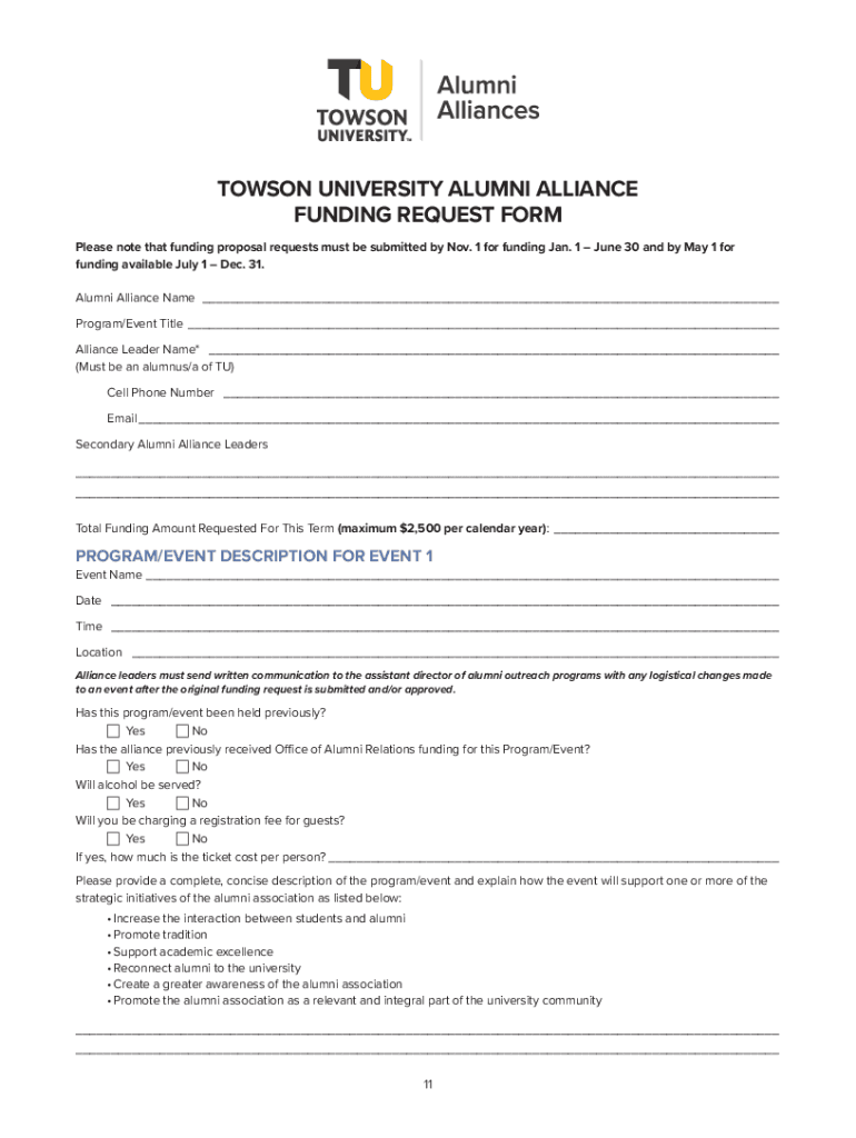TOWSON UNIVERSITY ALUMNI ALLIANCE FUNDING REQUEST FORM Please note that funding proposal requests must be submitted by Nov. 1 for funding Jan. 1 June 30 and by May 1 for funding available July 1 Dec.
