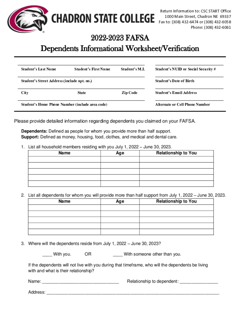 Return Information to: CSC START Office 1000 Main Street, Charon NE 69337 Fax to: (308) 4326474 or (308) 4326058 Phone: (308) 432606120222023 FAFSA Dependents Informational Worksheet/Verification