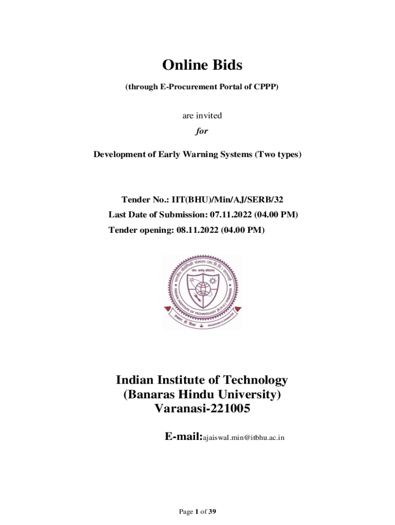 Online Bids (through Procurement Portal of PPP)are invited for Development of Early Warning Systems (Two types)Tender No.: IIT(BHU)/Min/AJ/SERB/32 Last Date of Submission: 07.11.2022 (04.00 PM) Tender