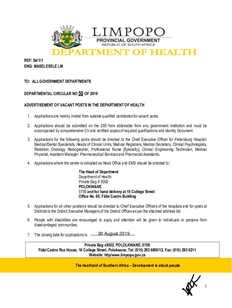 REF: S4/1/1 END: MASELESELE LM TO: ALL GOVERNMENT DEPARTMENTS DEPARTMENTAL CIRCULAR NO 50 OF 2019 Advertisement for VACANT POSTS IN THE DEPARTMENT OF HEALTH 1. Applications are hereby invited from