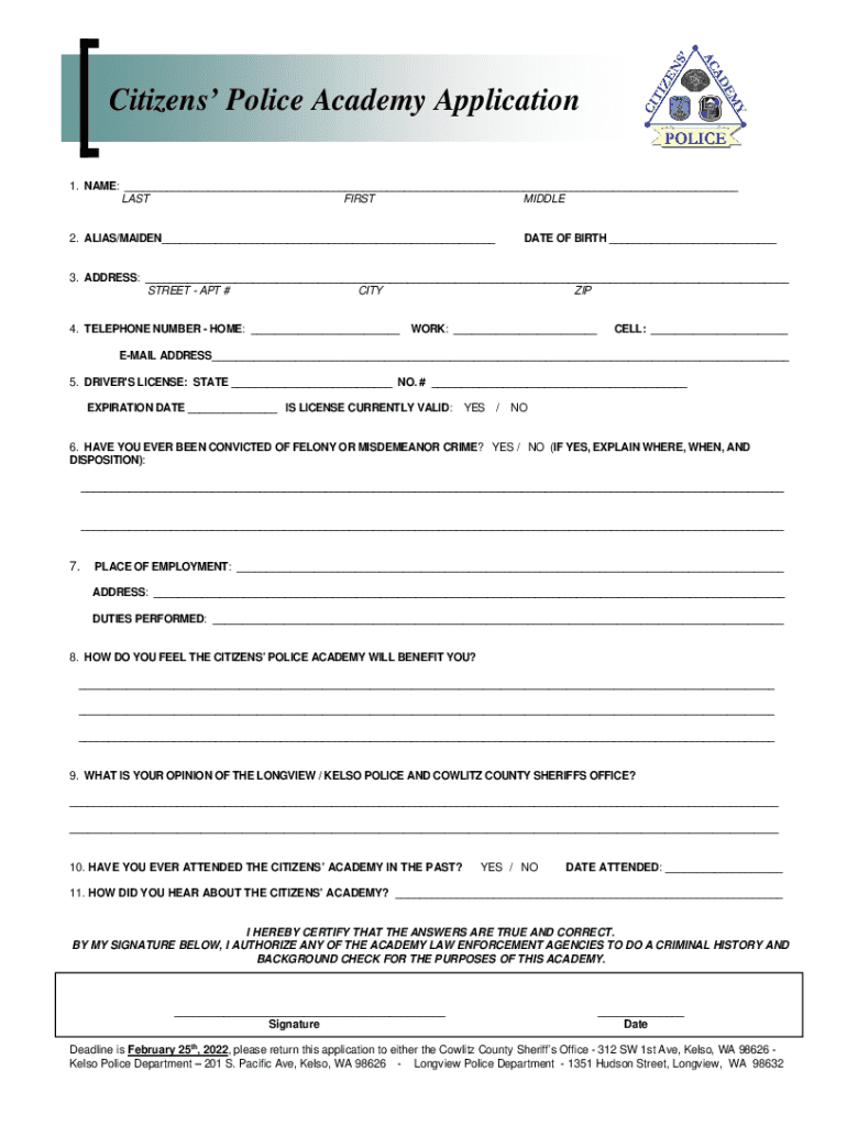 Citizens Police Academy Application 1. NAME: ___ LAST FIRST MIDDLE2. ALIAS/MAIDEN___DATE OF BIRTH ___3. ADDRESS: ___ STREET APT # CITY ZIP4. TELEPHONE NUMBER HOME: ___WORK: ___CELL: ___EMAIL ADDRESS___