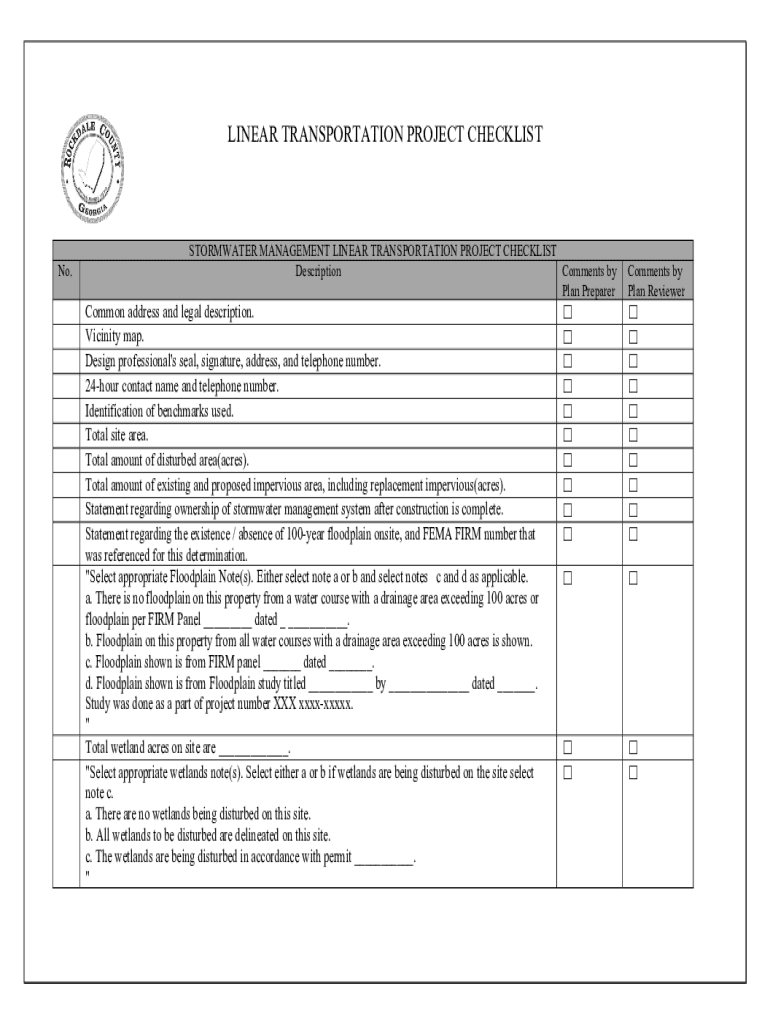 LINEAR TRANSPORTATION PROJECT CHECKLIST No. STORMWATER MANAGEMENT LINEAR TRANSPORTATION PROJECT CHECKLIST Description Comments by Plan PreparerCommon address and legal description. Vicinity map. Design