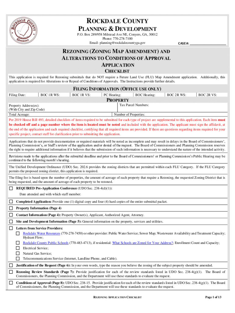 ROCKDALE COUNTY PLANNING & DEVELOPMENT P.O. Box 289/958 Mil stead Ave NE, Confers, GA, 30012 Phones: 7702787100 Email: planning@rockdalecountyga.govCASE #:REZONING (ZONING MAP AMENDMENT) AND ALTERATIONS