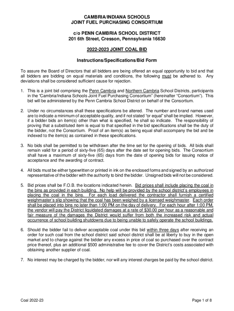 CAMBRIA/INDIANA SCHOOLS JOINT FUEL PURCHASING CONSORTIUM c/o PENN CAMBRIA SCHOOL DISTRICT 201 6th Street, Cress on, Pennsylvania 16630 20222023 JOINT COAL BID Instructions/Specifications/Bid Form