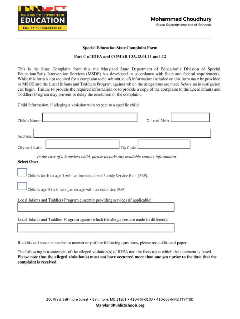 Special Education State Complaint Form Part C of IDEA and COMA 13A.13.01.11 and .12 This is the State Complaint form that the Maryland State Department of Educations Division of Special Education/Early