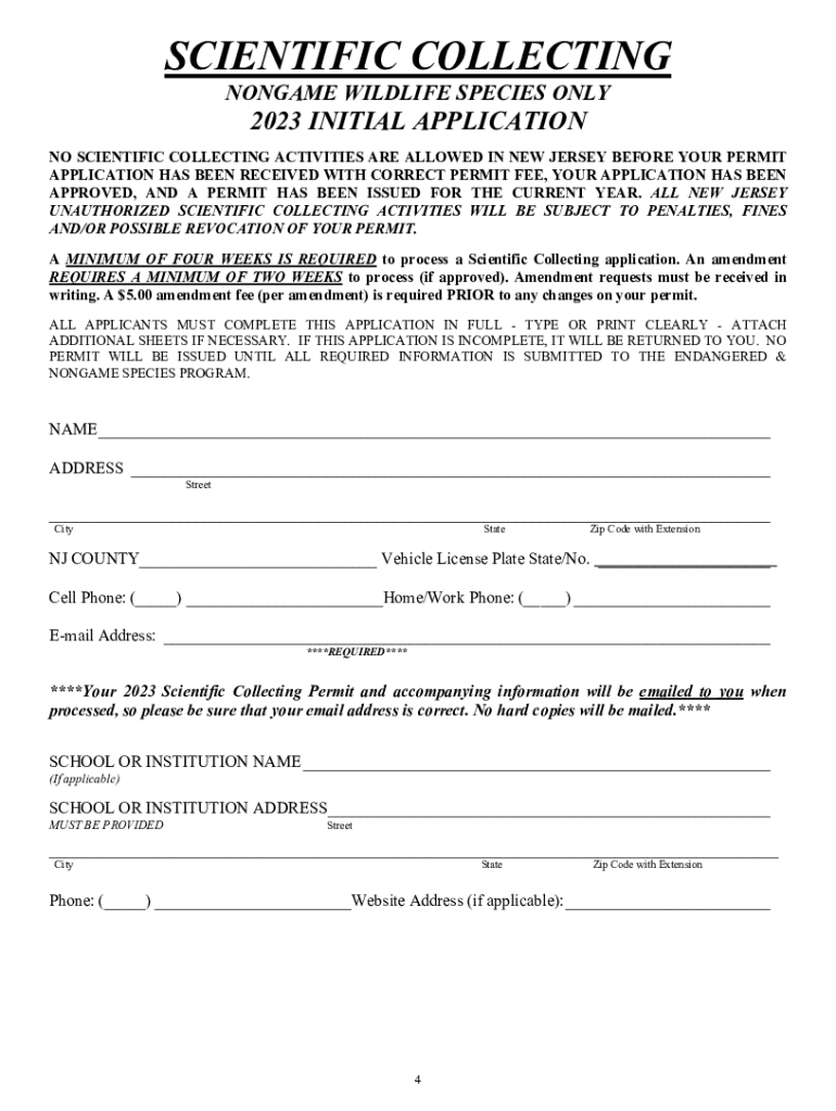2023 INITIAL APPLICATION JERSEY FISH AND WILDLIFE ENDANGERED & NONAGE SPECIES PROGRAM Attn: Scientific Collecting Permits Mail Code 50103 P.O. Box 420 Trenton, NJ 086250420 Email Address: scientificcollectingpermits@dep.nj.gov