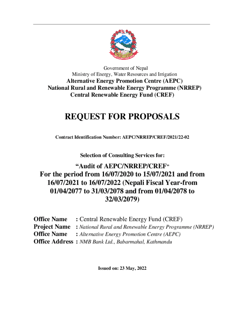 Government of Nepal Ministry of Energy, Water Resources and IrrigationAlternative Energy Promotion Center (APC) National Rural and Renewable Energy Program (NR REP) Central Renewable Energy Fund (CREW)REQUEST