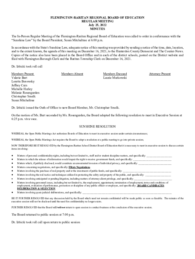 FLEMINGTONRARITAN REGIONAL BOARD OF EDUCATION REGULAR MEETING July 25, 2022, MINUTES The Unperson Regular Meeting of the FlemingtonRaritan Regional Board of Education was called to order in conformance