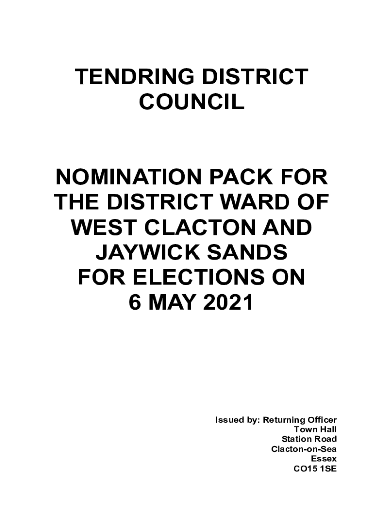 TENDING DISTRICT COUNCIL NOMINATION PACK FOR THE DISTRICT WARD OF WEST CLAYTON AND WARWICK SANDS FOR ELECTIONS ON 6 MAY 2021Issued by: Returning Officer Town Hall Station Road ClactononSea Essex CO15