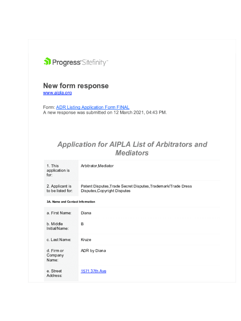 New form response www.aipla.orgForm: ADR Listing Application Form FINAL A new response was submitted on 12 March 2021, 04:43 PM. Application for AI PLA List of Arbitrators and Mediators 1. This application