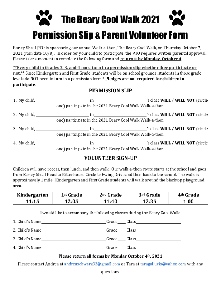 The Bear Cool Walk 2021 Permission Slip & Parent Volunteer Form Barley Sheaf PTO is sponsoring our annual Hackathon, The Bear Cool Walk, on Thursday, October 7, 2021 (rain date 10/8). In order for
