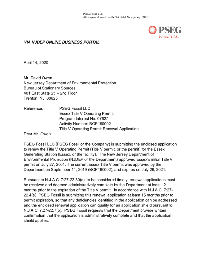 PEG Fossil LLC 40 Crag wood Road, South Plainfield, New Jersey 07080Fossil LLC VIA NJ DEP ONLINE BUSINESS PORTAL April 14, 2020, Mr. David Owen New Jersey Department of Environmental Protection Bureau