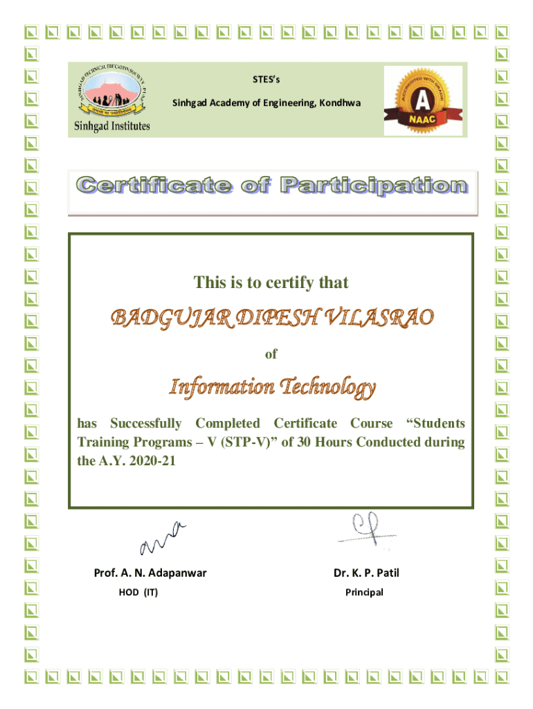 Steps Sinbad Academy of Engineering, KondhwaThis is to certify thatBADGUJAR DIP ESH information Technology has Successfully Completed Certificate Course Students Training Programs V (STP) of 30 Hours