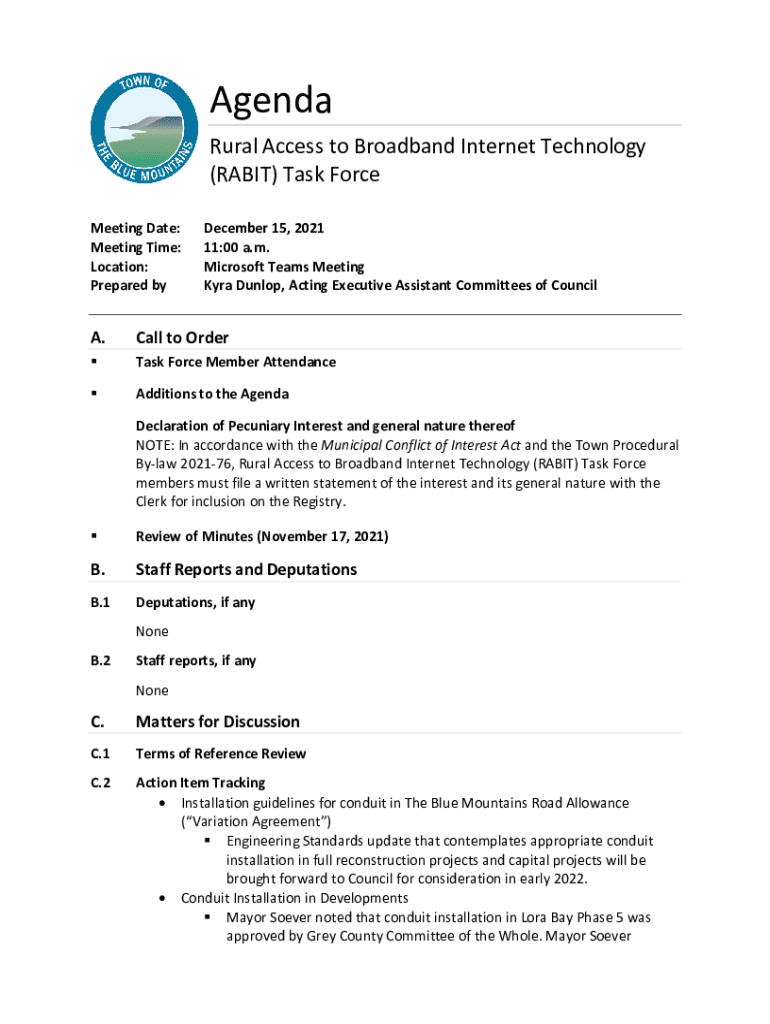 Agenda Rural Access to Broadband Internet Technology (HABIT) Task Force Meeting Date: Meeting Time: Location: Prepared by December 15, 2021 11:00 a.m. Microsoft Teams Meeting Kyra Dunlop, Acting Executive