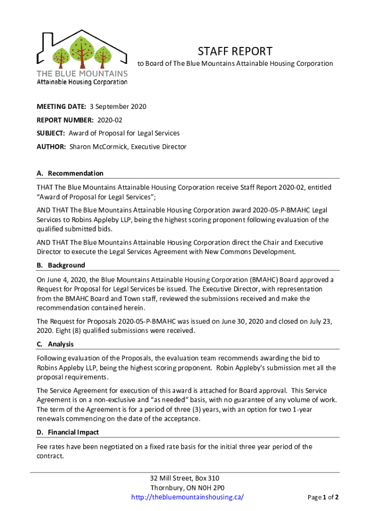 STAFF REPORT to Board of The Blue Mountains Attainable Housing CorporationMEETING DATE: 3 September 2020 REPORT NUMBER: 202002 SUBJECT: Award of Proposal for Legal Services AUTHOR: Sharon McCormick,