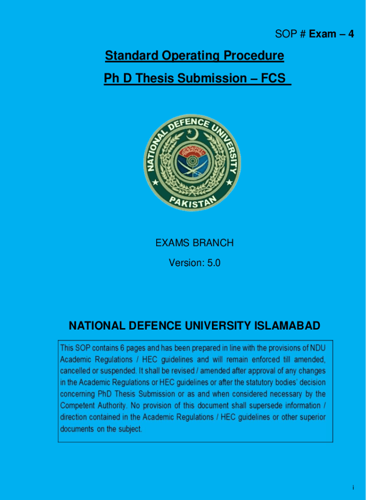 SOP # Exam 4Standard Operating Procedure Ph.D. Thesis Submission EXAMS BRANCH Version: 5.0NATIONAL Defense UNIVERSITY ISLAMABADiRecord of Approvals/Revisions Preapproval DateEffectiveApproving AuthorityRevision