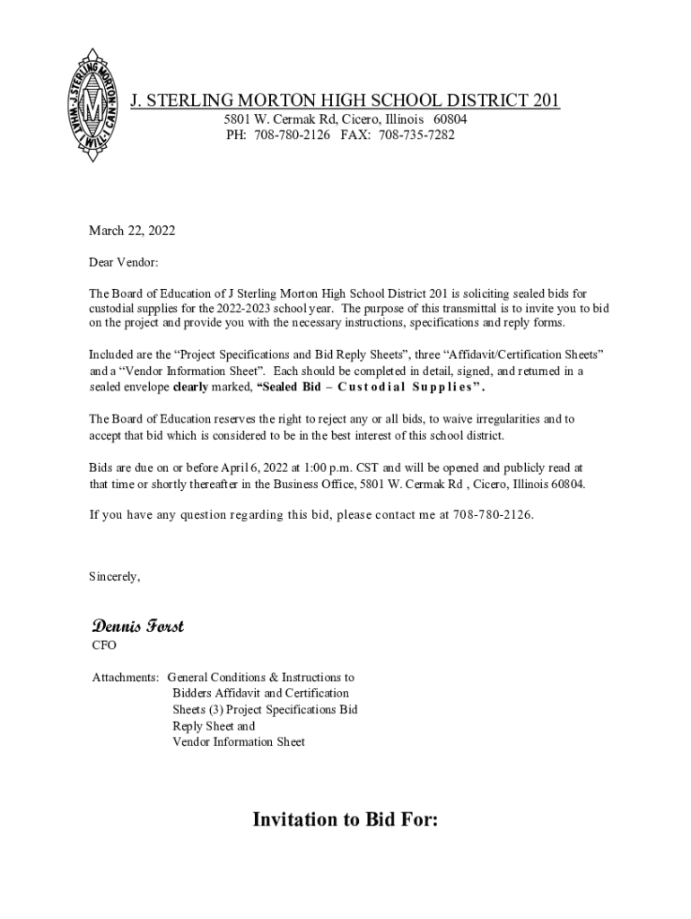 J. STERLING MORTON HIGH SCHOOL DISTRICT 201 5801 W. CERMAV Rd, Cicero, Illinois 60804 PH: 7087802126 FAX: 7087357282March 22, 2022 Dear Vendor: The Board of Education of J Sterling Morton High School