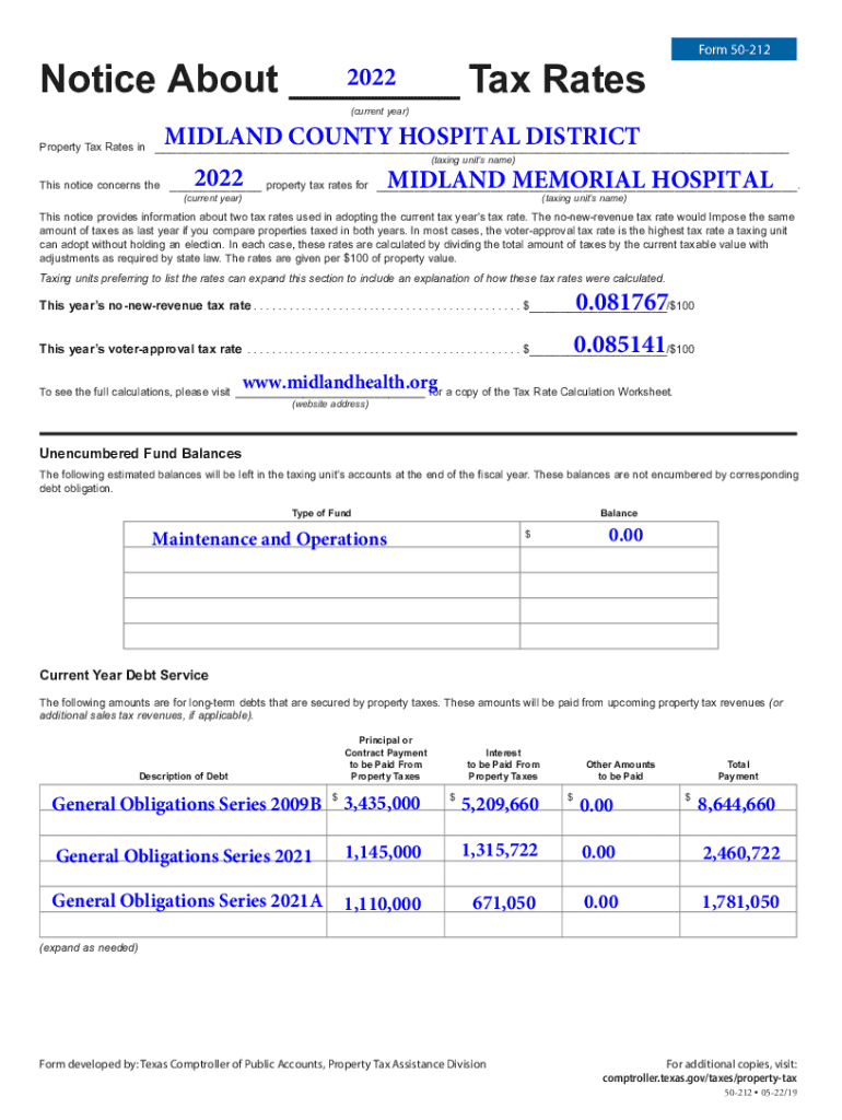 Form 502122022 Notice About ___ Tax Rates (current year)Property Tax Rates Midland COUNTY HOSPITAL DISTRICT___This notice concerns the2022___ (current year)(taxing units name)property tax rates farmland