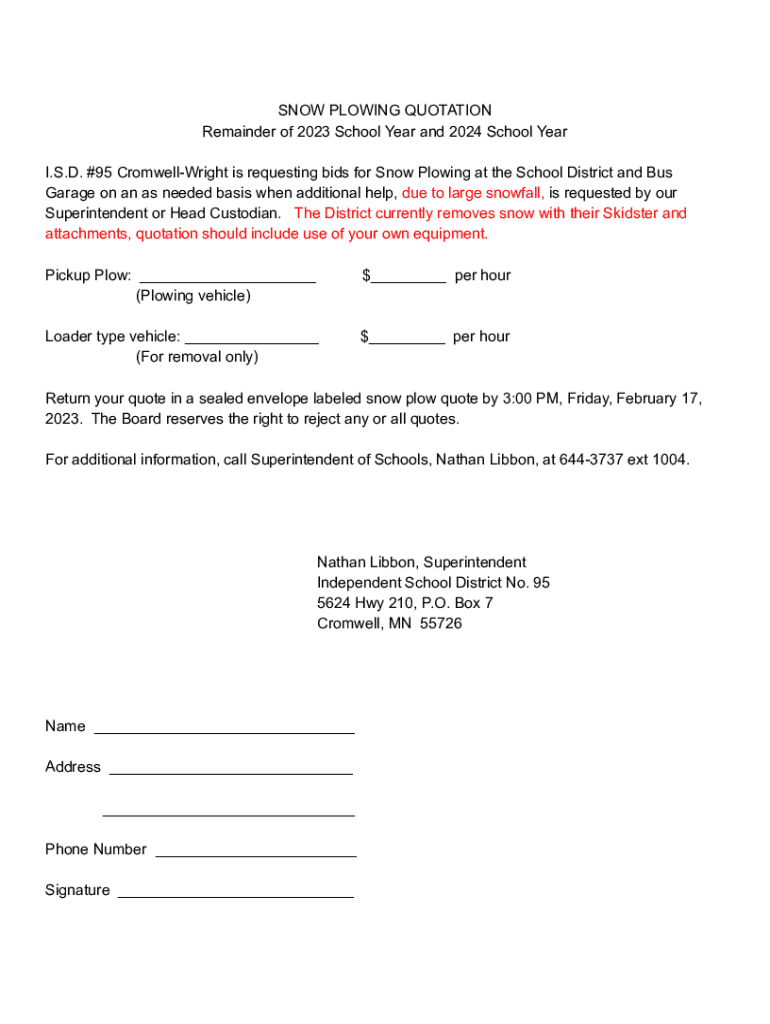 SNOW PLOWING QUOTATION Remainder of 2023 School Year and 2024 School Year I.S.D. #95 Cromwell Wright is requesting bids for Snow Plowing at the School District and Bus Garage on an as needed basis