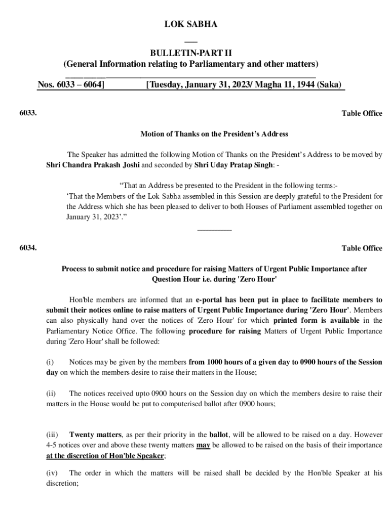 OK SASHA ___ BULLETINPART II (General Information relating to Parliamentary and other matters) ___ Nos. 6033 6064] [Tuesday, January 31, 2023/ Mafia 11, 1944 (Aka) 6033. Table Office Motion of Thanks