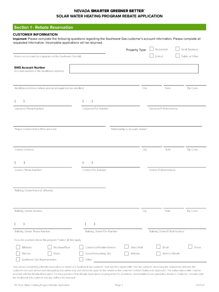 NEVADA SMARTER GREENER BETTER SOLAR WATER HEATING PROGRAM REBATE APPLICATIONInvest In A Better Environment Southwest Gas offers rebates to eligible Nevada customers on qualifying solar thermal systems