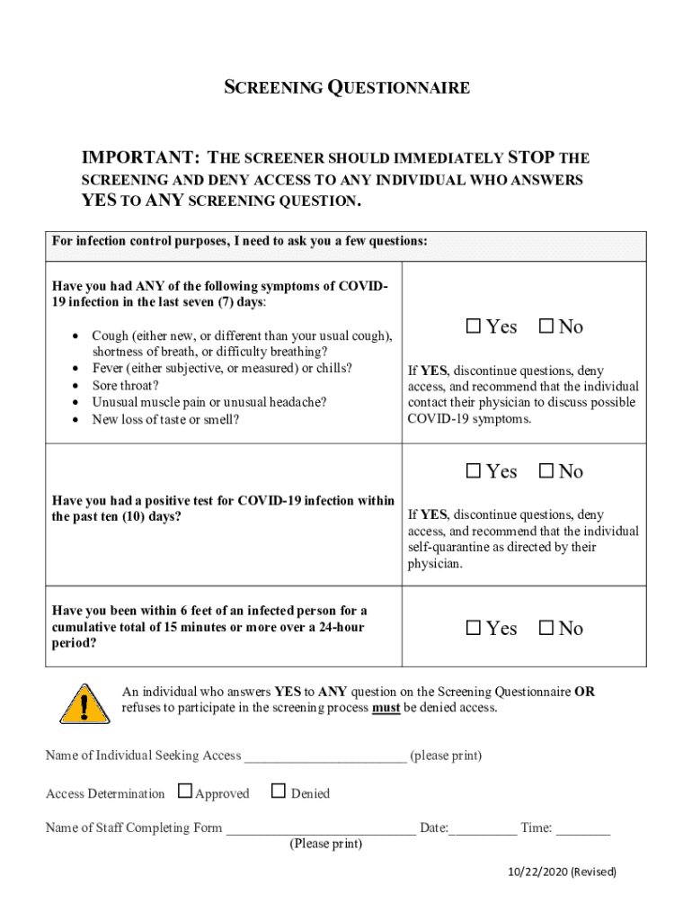 SCREENING QUESTIONNAIRE IMPORTANT: THE SCREENER SHOULD IMMEDIATELY STOP PRESCREENING AND DENY ACCESS TO ANY INDIVIDUAL WHO ANSWERS YES TO ANY SCREENING QUESTION. For infection control purposes, I