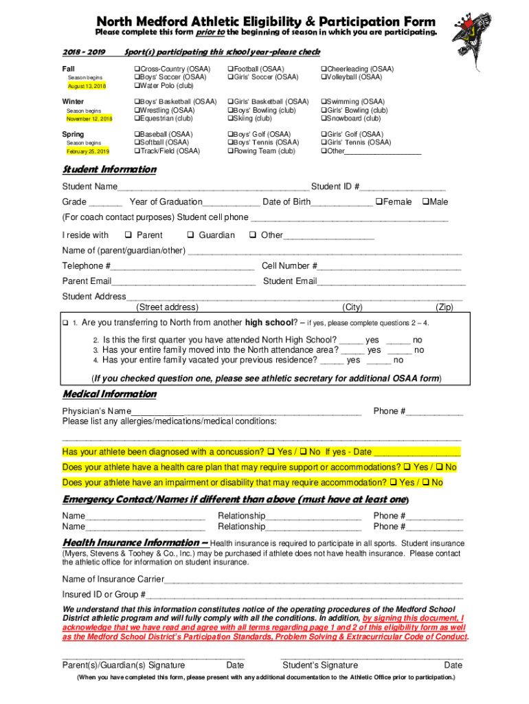 North Medford Athletic Eligibility & Participation Formulas complete this form prior to the beginning of season in which you are participating.2018 2019 Fall Season begins August 13, 2018Winter Season
