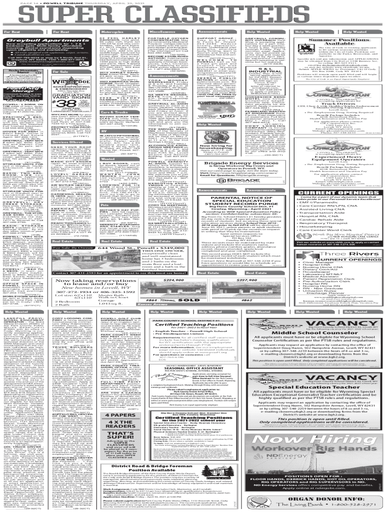 SUPER CLASSIFIEDS PAGE 14 POWELL TRIBUNE THURSDAY, APRIL 22, 2021For Mentor RentGreybull Apartments Now accepting applications for 1, 2 & 3 bedroom acts. Multifamily affordable housing. Rental assistance
