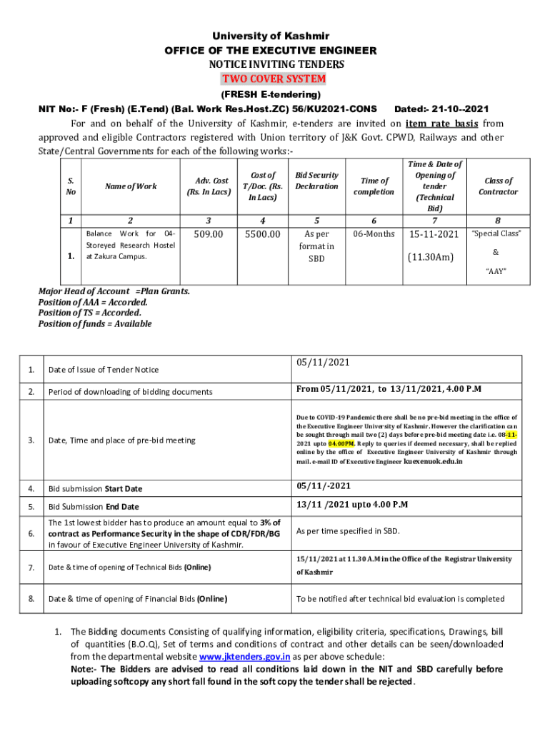 University of Kashmir OFFICE OF THE EXECUTIVE ENGINEERNOTICE INVITING TENDERS TWO COVER SYSTEM (FRESH Tendering) NIT No: F (Fresh) (E. Tend) (Bad. Work Res.Host.ZC) 56/KU2021CONSDated: 21102021For