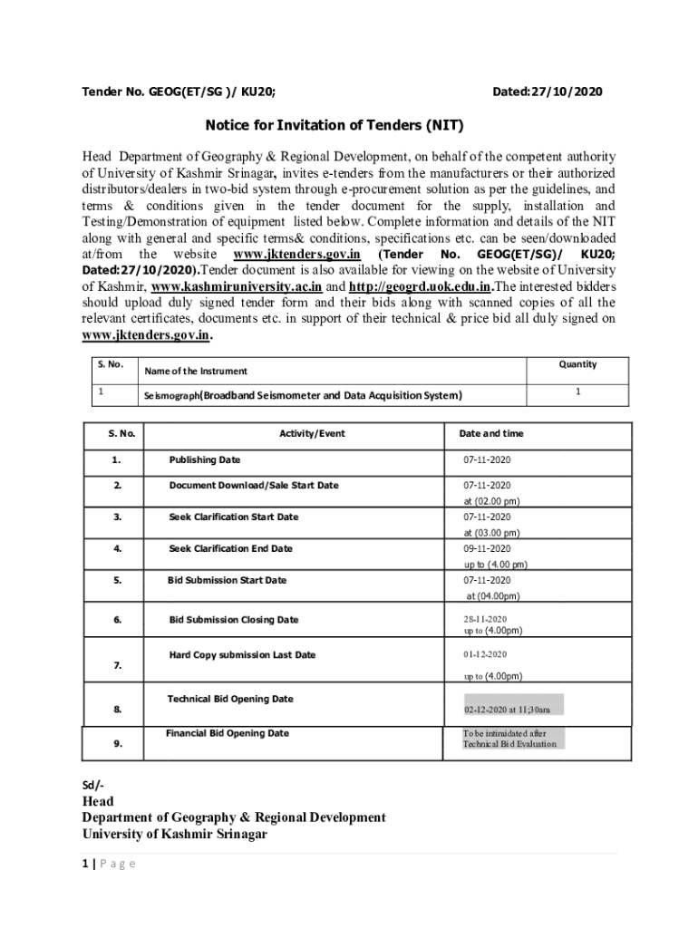 Tender No. GEOG(ET/SG)/ KU20;Dated:27/10/2020Notice for Invitation of Tenders (NIT) Head Department of Geography & Regional Development, on behalf of the competent authority of University of Kashmir