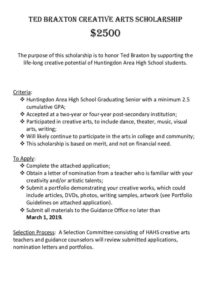 Ted Braxton Creative Arts Scholarship$2500 The purpose of this scholarship is to honor Ted Braxton by supporting the lifelong creative potential of Huntington Area High School students. Criteria: