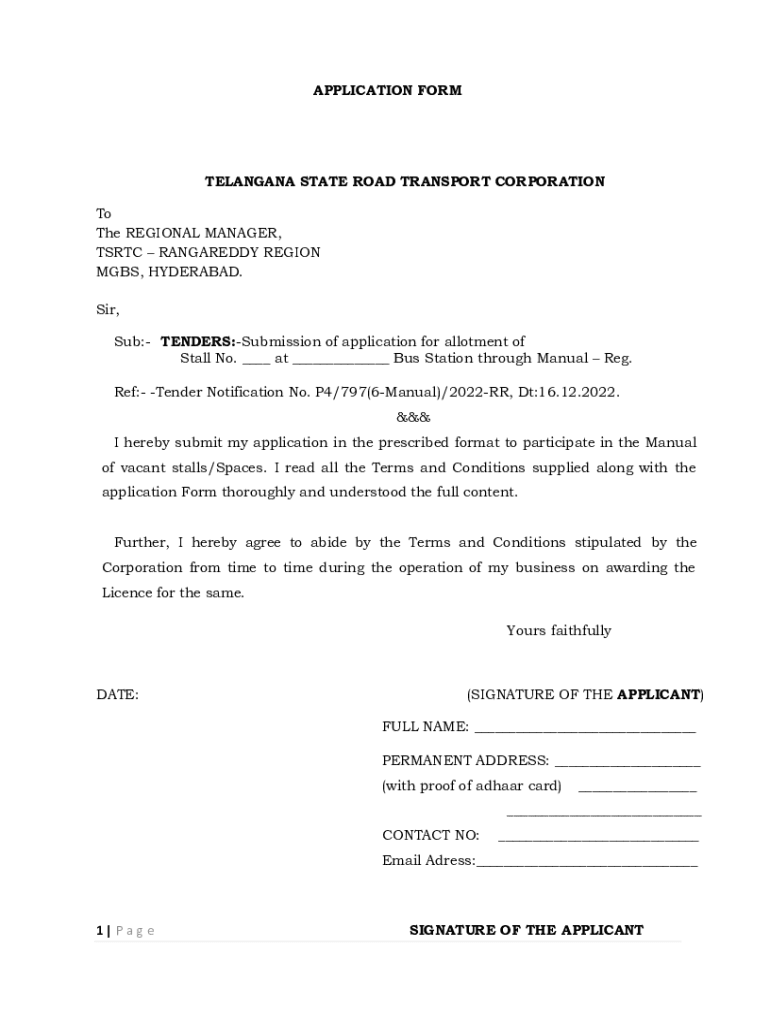 APPLICATION FORMTELANGANA STATE ROAD TRANSPORT CORPORATION To The REGIONAL MANAGER, TS RTC RANGAREDDY REGION MOBS, HYDERABAD. Sir, Sub: TENDERS:Submission of application for allotment of Stall No.