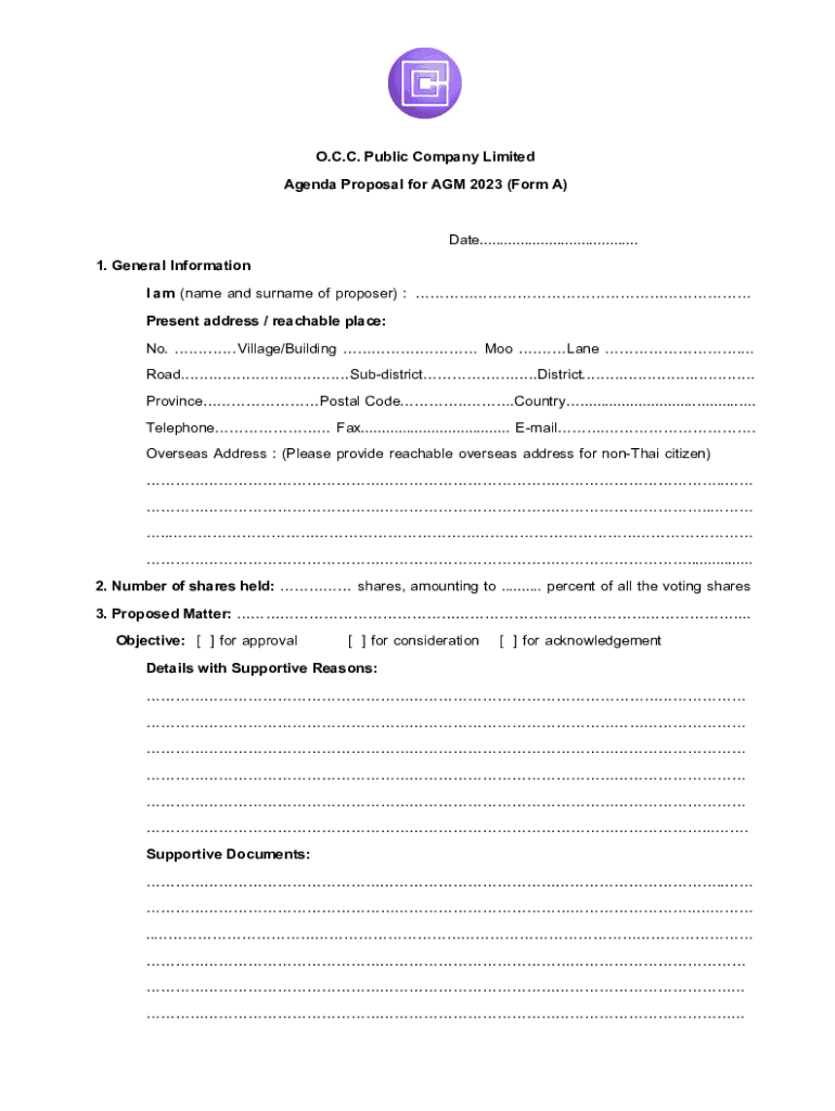 O.C.C. Public Company Limited Agenda Proposal for AGM 2023 (Form A) Date....................................... 1. General Information I am (name and surname of proposer) : Present address / reachable