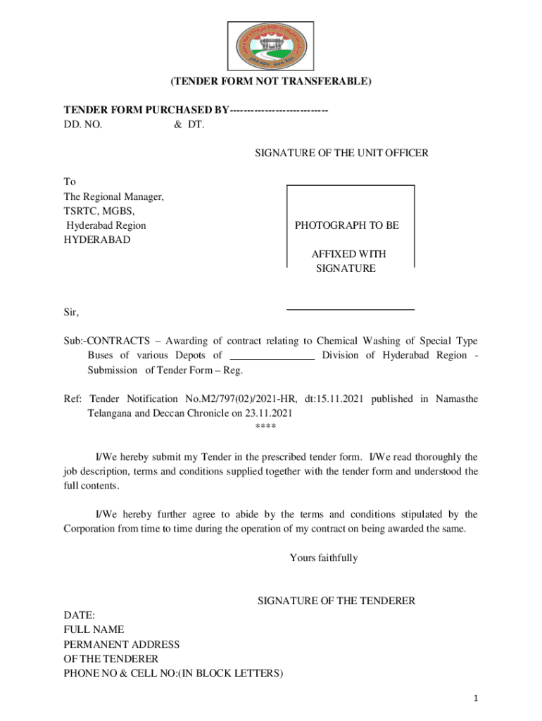 (TENDER FORM NOT TRANSFERABLE) TENDER FORM PURCHASED BYRD. NO. & DT. SIGNATURE OF THE UNIT OFFICER To The Regional Manager, TS RTC, MOBS, Hyderabad Region HYDERABADPHOTOGRAPH TO BE AFFIXED WITH SIGNATURE