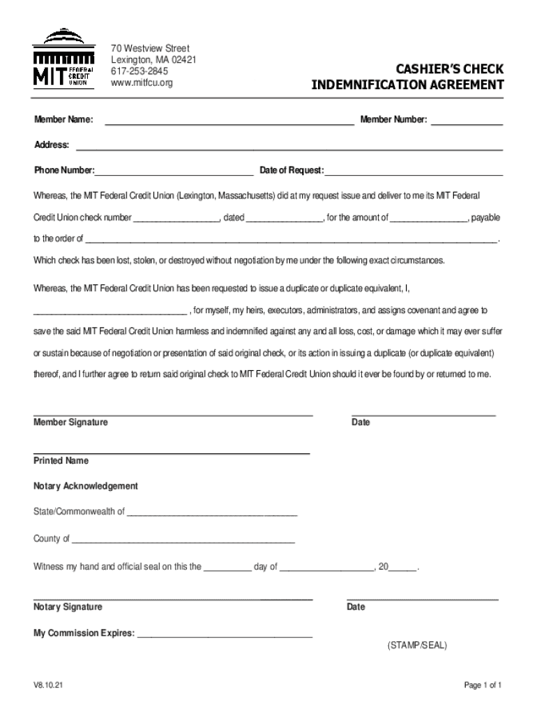 70 West view Street Lexington, MA 02421 6172532845 www.mitfcu.orgCASHIERS CHECK INDEMNIFICATION AGREEMENTMember Name:Member Number:Address: Phone Number:Date of Request:Whereas, the MIT Federal Credit