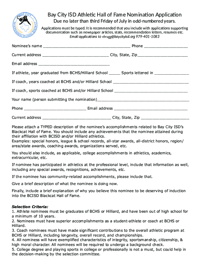 Bay City ISD Athletic Hall of Fame Nomination Application Due no later than third Friday of July in odd numbered years. Applications must be typed. It is recommended that you include with applications