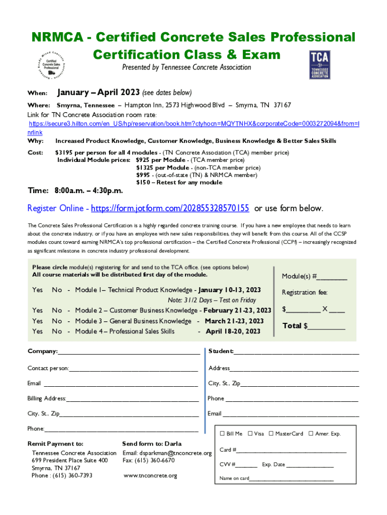 NR MCA Certified Concrete Sales Professional Certification Class & Exam Presented by Tennessee Concrete AssociationWhen:January April 2023 (see dates below)Smyrna, Tennessee Hampton Inn, 2573 High