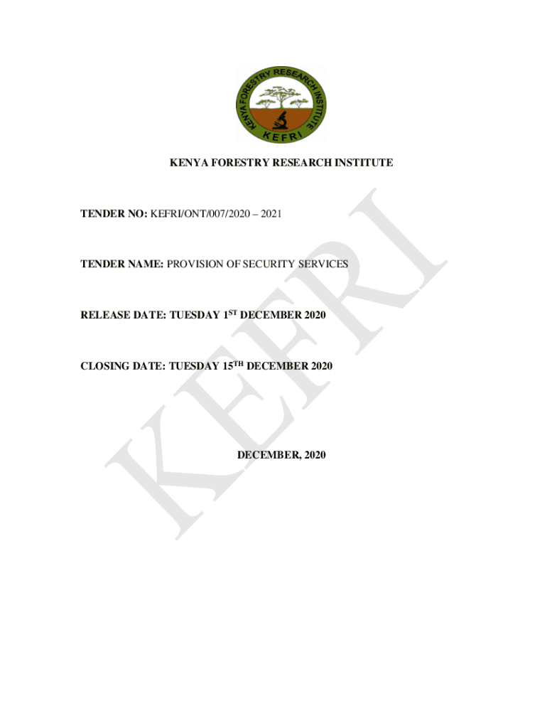 KENYA FORESTRY RESEARCH INSTITUTETENDER NO: KERI/ONT/007/2020 2021TENDER NAME: PROVISION OF SECURITY SERVICESRELEASE DATE: TUESDAY 1ST DECEMBER 2020CLOSING DATE: TUESDAY 15TH DECEMBER 2020DECEMBER,
