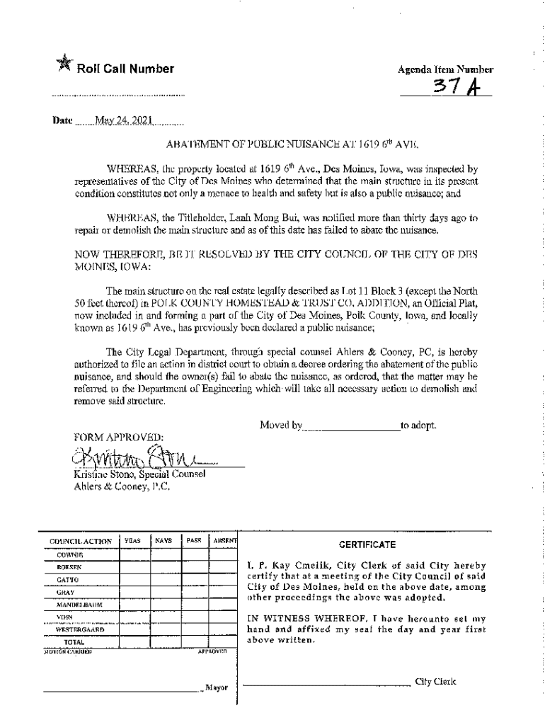 Roll Call NumberDateAgenda Item Number37 A. May.24,2Q21,ABATEMENT OF PUBLIC NUISANCE AT 1619 6th AVE.