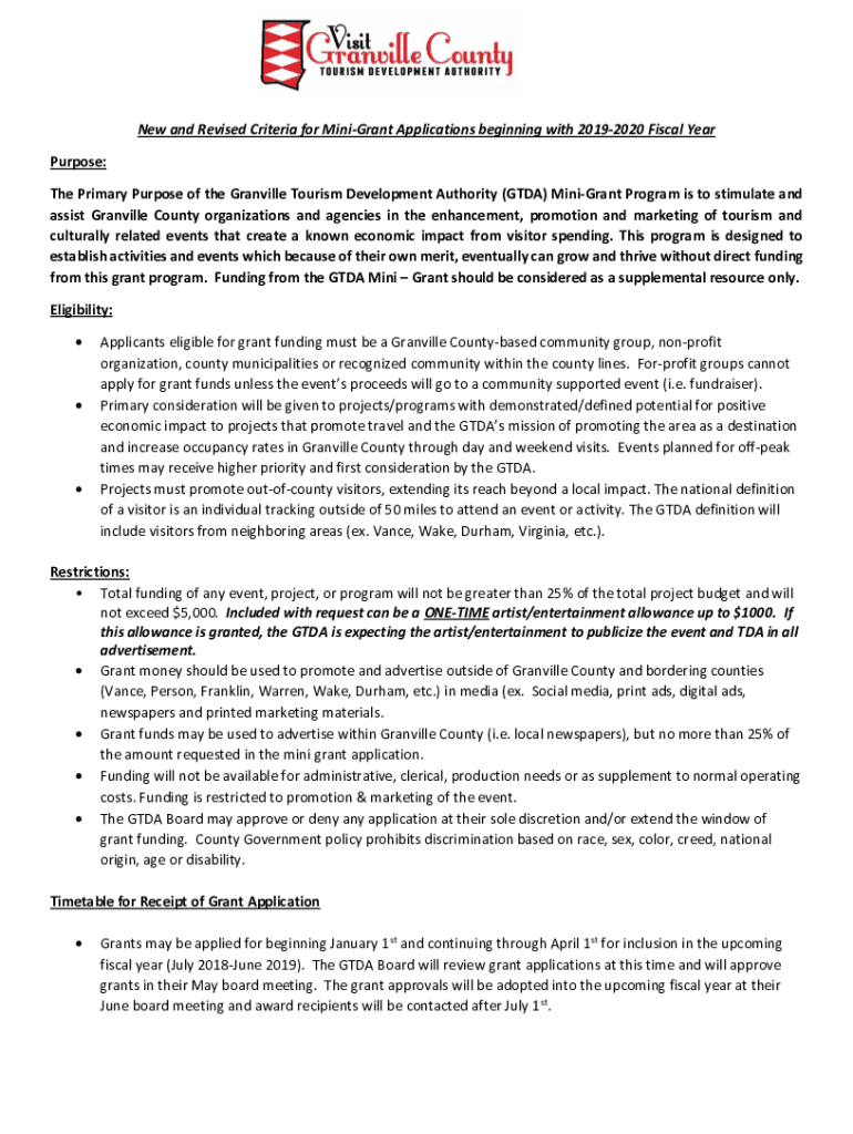 New and Revised Criteria for MiniGrant Applications beginning with 20192020 Fiscal Year Purpose: The Primary Purpose of the Granville Tourism Development Authority (GTA) MiniGrant Program is to stimulate