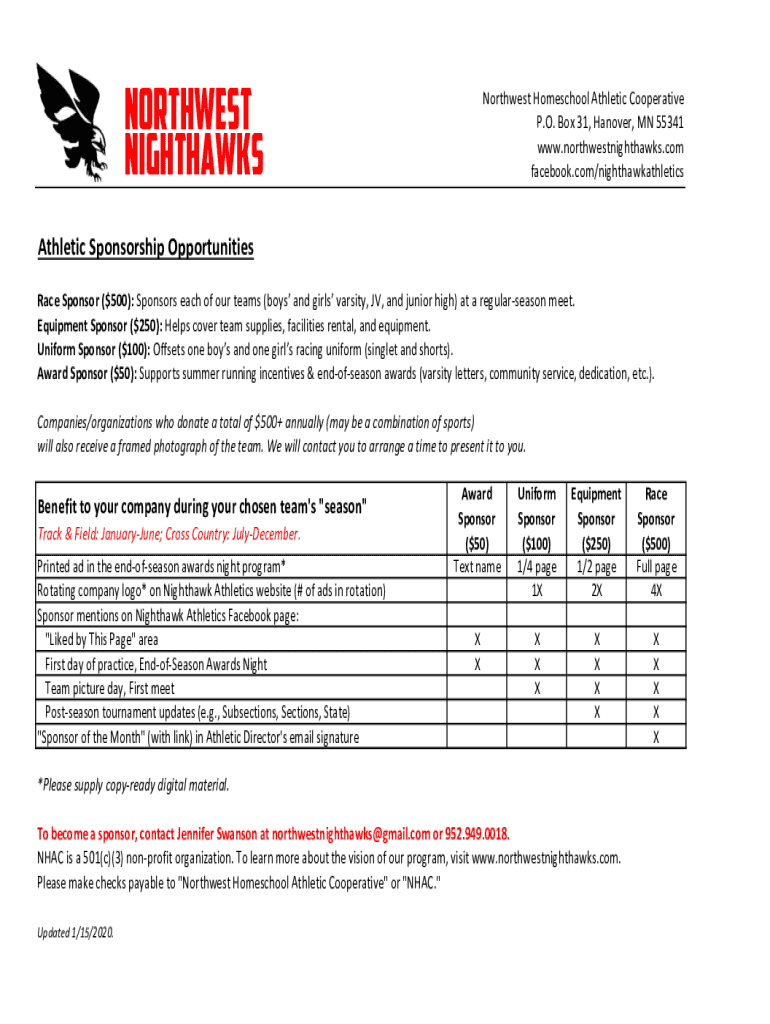 Northwest Nighthawks Northwest Homeschool Athletic Cooperative P.O. Box 31, Hanover, MN 55341 www.northwestnighthawks.com facebook.com/nighthawkathleticsAthletic Sponsorship Opportunities Race Sponsor