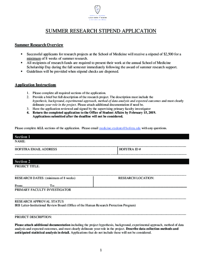 SUMMER RESEARCH STIPEND APPLICATION Summer Research Overview Successful applicants for research projects at the School of Medicine will receive a stipend of $2,500 for a minimum of 8 weeks of summer